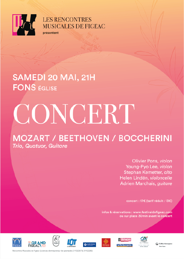 Samedi 20 mai 21h, à l’Eglise de Fons: Ils nous régaleront d’un programme qui tient à cœur depuis longtemps à Olivier, programme de musique de chambre en trio, quatuor et quintette : de Beethoven, le quatuor N°4 en sol mineur, qui fit grand bruit de son temps ; de Mozart le divertimento pour trio à cordes KV 563 ; et enfin le Quintette avec Guitare de Boccherini, ou Fandango, qui marquera forcément les esprits !